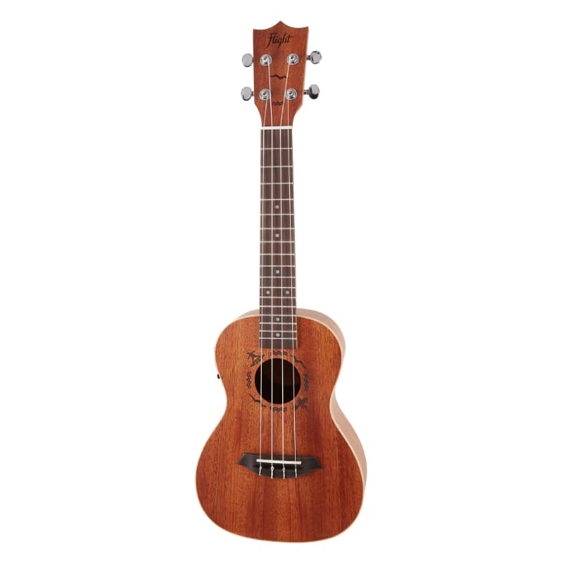 Elektroakustické koncertní ukulele Flight DUC 323 MAH EQ Natural má tělo zhotovené z laminovaného mahagonu. Krk a hmatník nástroje jsou vyrobeny z afrického okoumé a ořechu, což je rovněž poměrně často používaná kombinace dřev. Struny jsou přes nultý a sedlový pražec z kosti ukotveny v chromovaných ladicích mechanikách kytarového typu (Die-Cast Geared) a ořechové kobylce. Úspornější design zpestřuje v případě modelů z řady Designer Series rozeta v podobě dekorativní laserové rytiny.